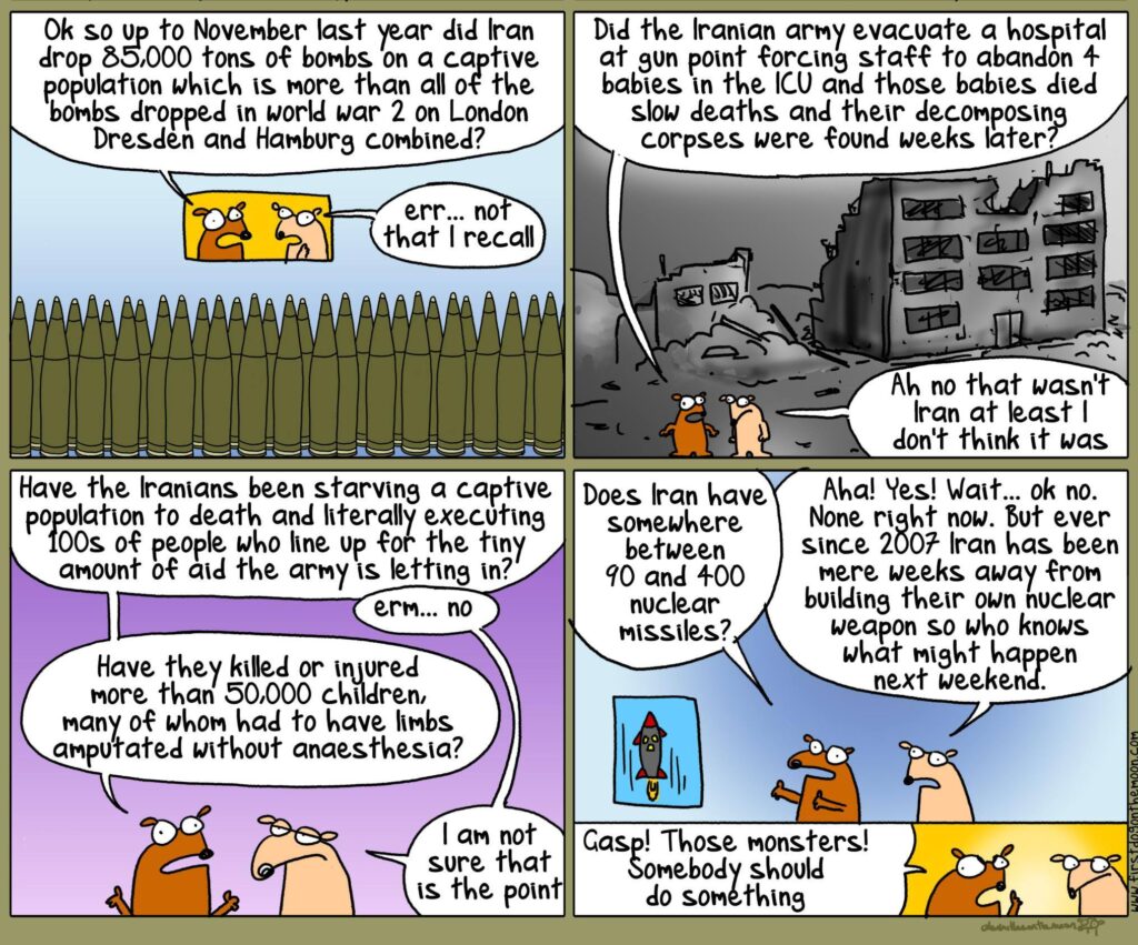 The cartoon is structured as a series of leading questions, all falsely implying that Israel has committed heinous, Iran-style atrocities: