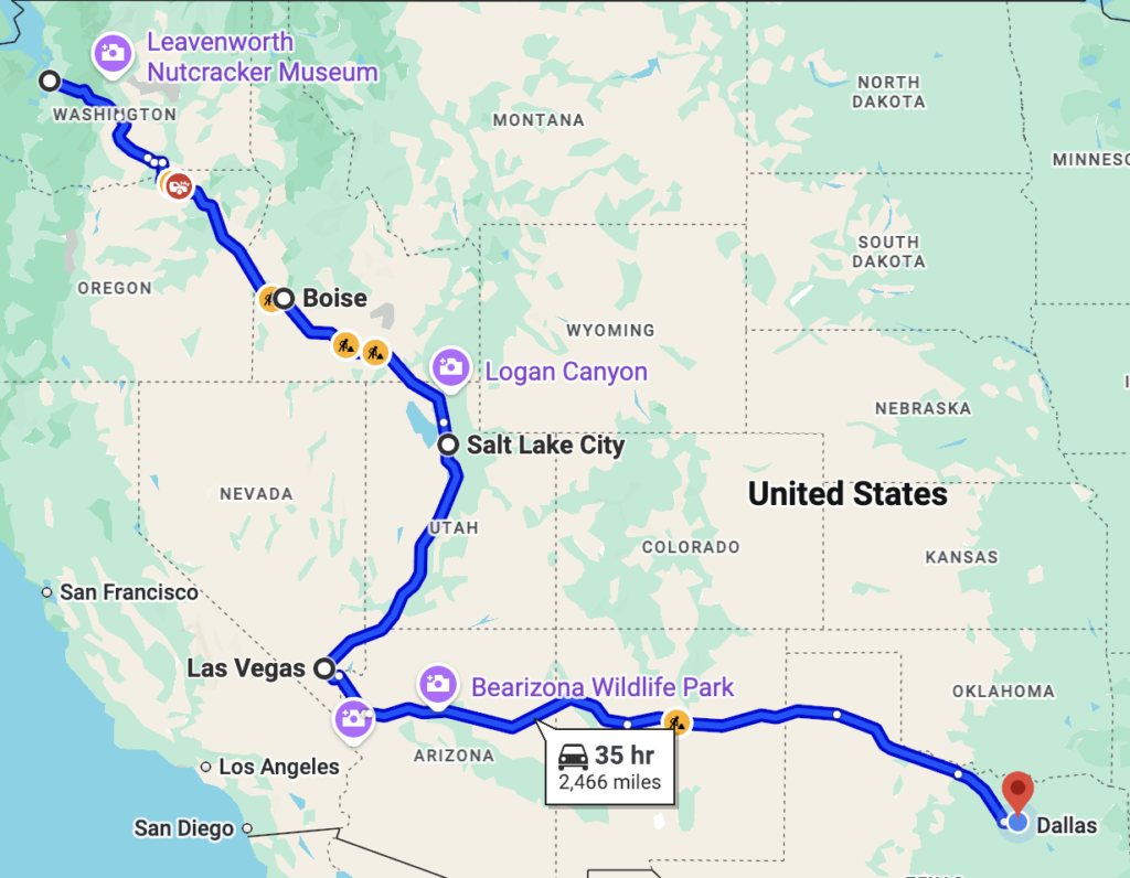 We knew the most direct route would take just over 31 hours, but it cut through Colorado and higher elevation mountain passes — beautiful, but risky in late November. As a learner driver (and new to manuals), Penelope didn’t need icy climbs and snow-covered descents as her classroom. So we chose a longer route instead: one with fewer passes, gentler grades, and a much lower chance of winter weather. A few extra hours felt like a small price for a safer, more confidence-building drive.